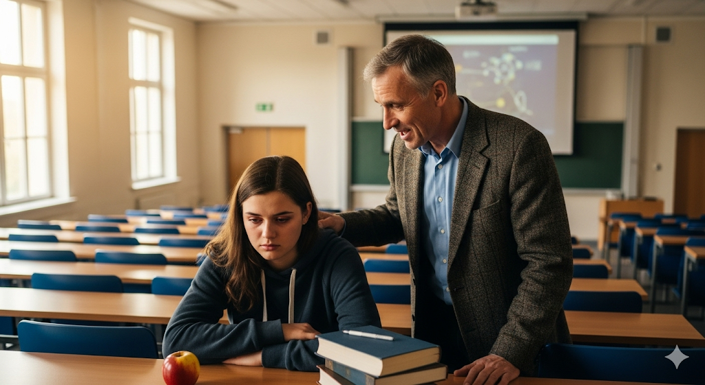 Именно в этот момент к ней подошёл преподаватель, Виктор Сергеевич, мужчина лет пятидесяти, который принимал у неё экзамен. Он был известен своей строгостью, но сейчас в его глазах было сочувствие.
