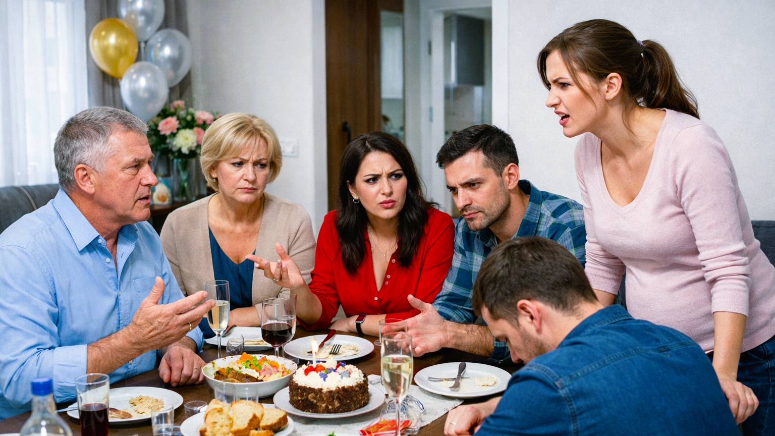 Воцарилась тишина. Все смотрели на беременную женщину. Георгий Михайлович отложил вилку. Таисия Владимировна медленно поставила бокал на стол. Атмосфера сгустилась, стала тяжёлой, давящей.