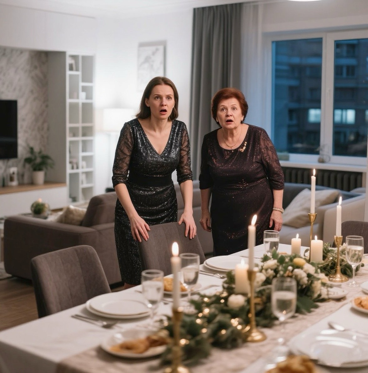 Людмила Петровна стояла у холодильника с бокалом шампанского в руке, Таня сидела за кухонным столом с тарелкой канапе. Обе замерли, увидев меня в дверном проеме.