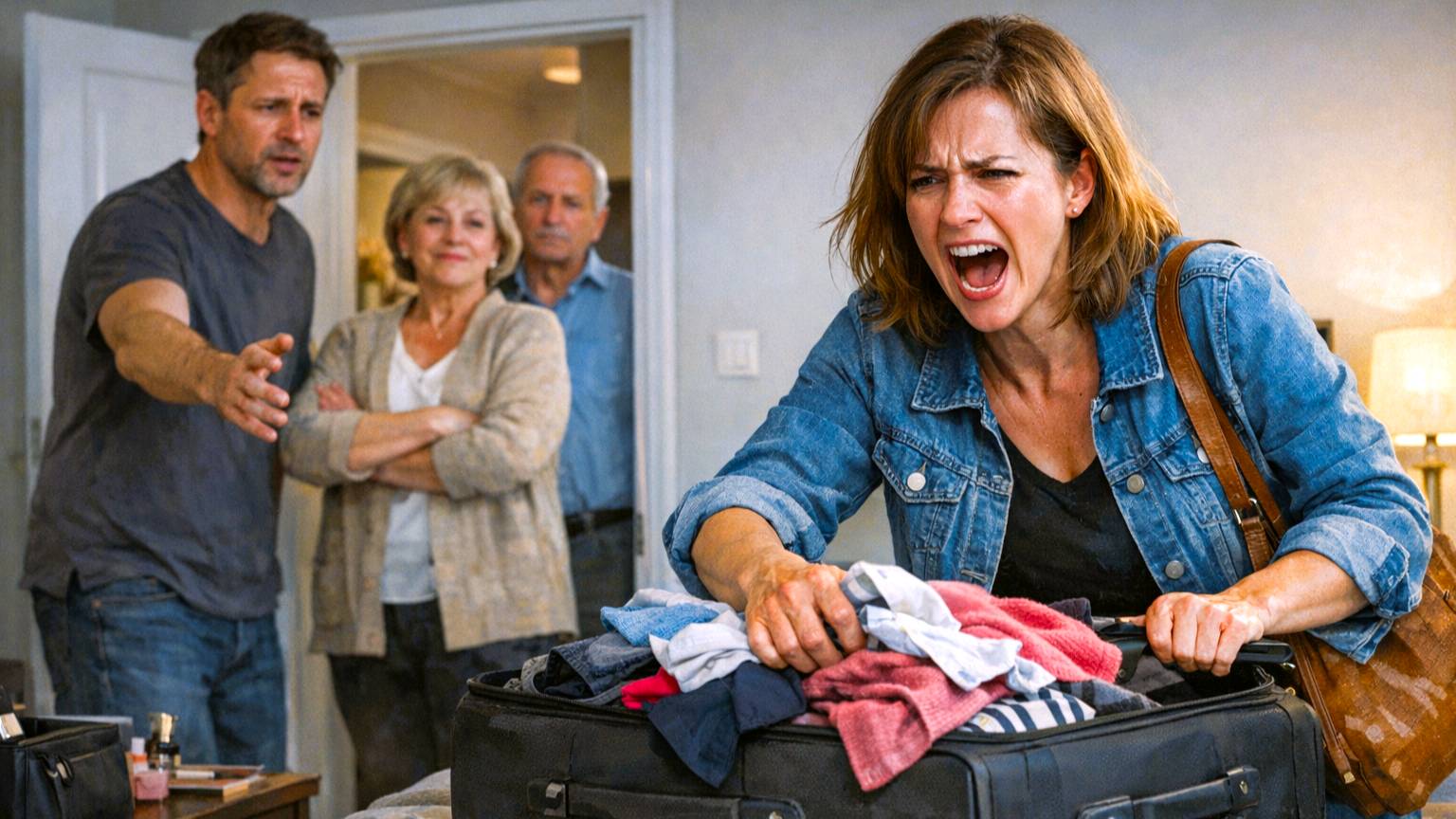 Полина прошла в спальню. Достала чемодан с антресолей. Начала швырять туда вещи — одежду, косметику, обувь. Андрей ворвался следом.