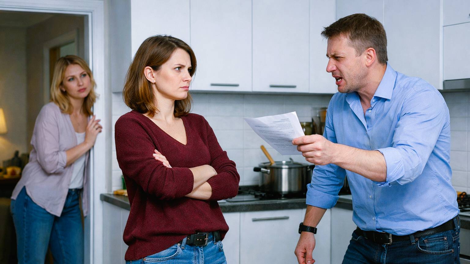 Андрей молчал. Лицо красное, кулаки сжаты. Потом развернулся и вышел из кухни, хлопнув дверью. Елена высунулась из гостиной, посмотрела на Анну с любопытством.