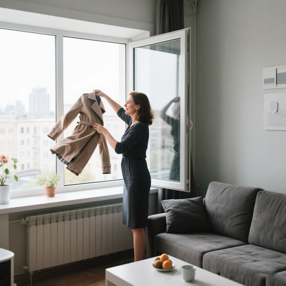 Но Лариса уже брала с вешалки пальто свекрови и её сумочку. Её движения были четкими и решительными. Она вернулась в гостиную, прошла к окну и распахнула его настежь.