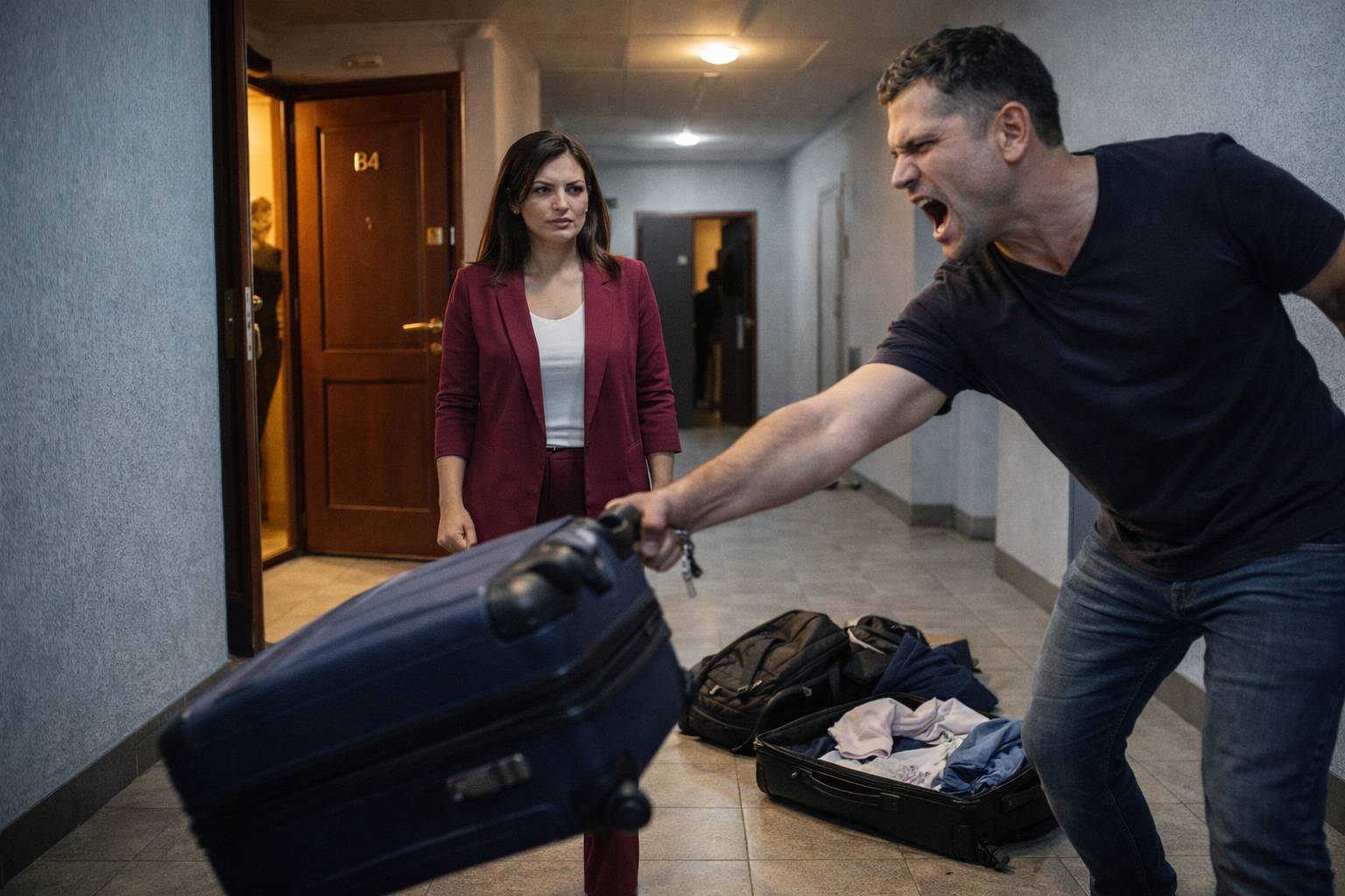 Он схватил чемодан и потащил его в коридор, грохоча по паркету. Следом полетела сумка с её рабочими бумагами — чертежи рассыпались по полу, но Рустаму было всё равно. Диана стояла не двигаясь, наблюдая за этим спектаклем. Она видела, как дрожат его руки, как напрягаются плечи, как он с трудом сдерживает желание что-нибудь ещё швырнуть. Рустам распахнул входную дверь нараспашку и с силой вытолкнул чемодан на лестничную площадку. Чемодан покатился, ударился о стену и остановился у лестницы. Сумка полетела следом.